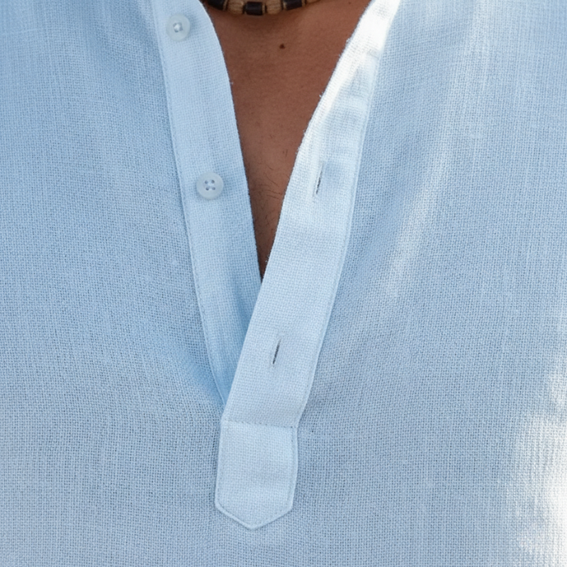 Design: Henley-style with band collar and long sleeves