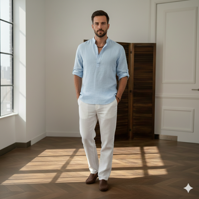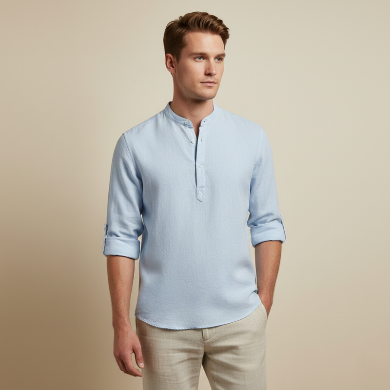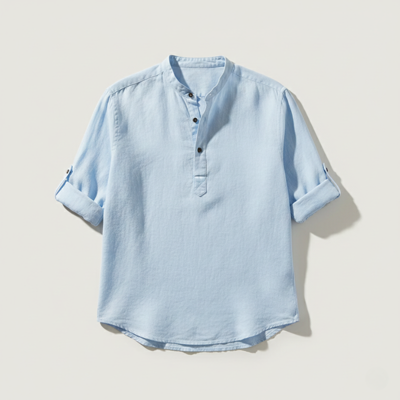 Stay comfortable and stylish with this men’s relaxed-fit shirt featuring a band collar and long sleeves, designed for lightweight breathability and effortless everyday wear. The soft cotton fabric and henley-style closure make it perfect for spring and summer outings, casual events, or leisure activities. Pair it with chinos for a relaxed look or with jeans and boots for a more rugged, stylish expression. Its versatile design ensures both comfort and contemporary appeal for warmer weather.