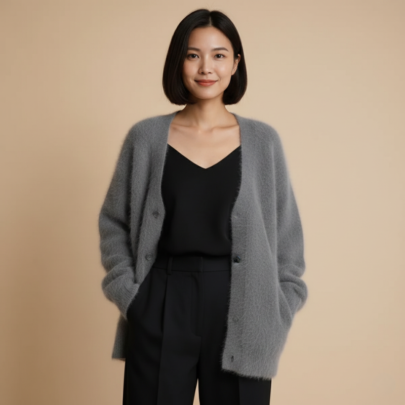 Elevate your wardrobe with this luxuriously soft mohair cardigan, designed in an oversized fit for ultimate comfort and effortless style. The long sleeves and classic button-front closure make it perfect for layering over shirts, blouses, or turtlenecks. Its fluffy texture adds a touch of refined elegance, making it ideal for both relaxed daytime looks and polished evening outfits. A timeless staple that keeps you warm, stylish, and chic all year round.